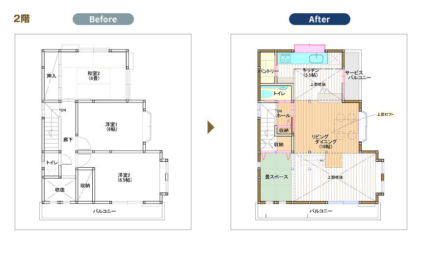 1階にあったLDKは日当たりが悪く、部屋数は多いけれど暮らしづらかったというOさんの家。そこで2階の3部屋をひとつながりにして、明るく開放的なLDKへと一新。ロフトとの一体感も持たせ、LDKにいながらロフトにいるお子さんとコミュニケーションがとれるようにしました。1階には子ども部屋を2つ配して、家全体では4LDKから2LDKに。部屋数は抑え、一つひとつの部屋を広くすることで未活用のスペースをなくし、快適で暮らしやすい住空間をご提案しました。内装は白で統一して広がり感を演出。家事をよりスムーズにできるように、パントリーや造作家具などの収納、洗濯物干し場のあるユーティリティなども設けています。